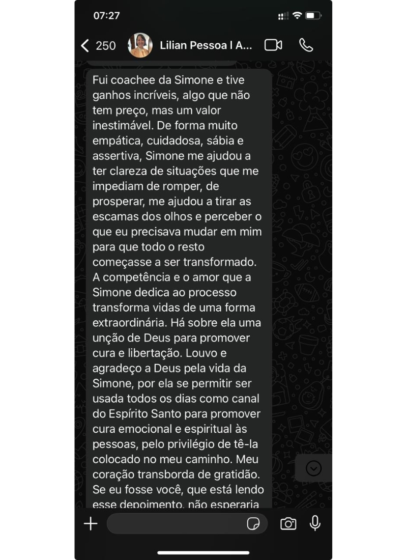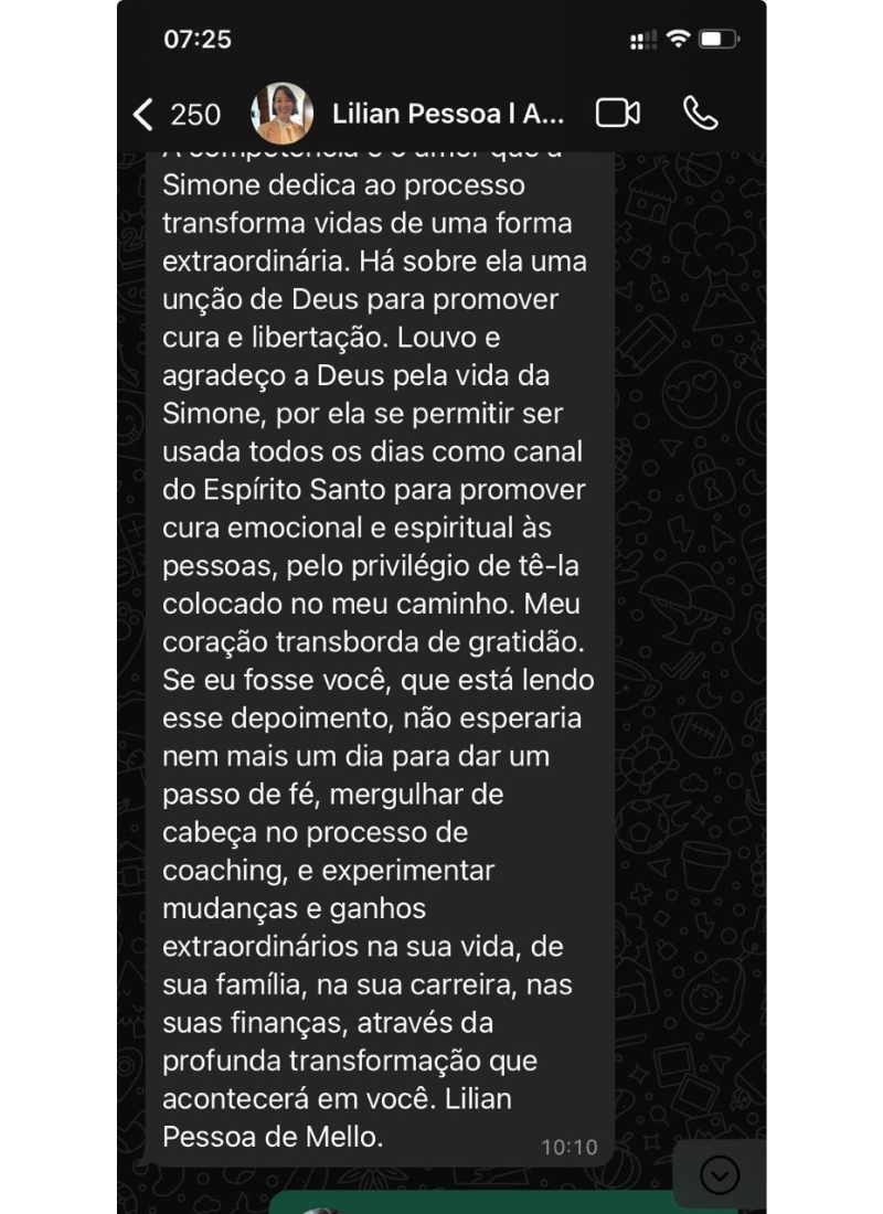 Sou Simone Curi Lucena — Coach Integral Sistêmico, Psicanalista e Terapeuta com abordagem cristã. Acredito no poder único de cada pessoa para transformar sua vida. Com técnicas integrativas, ofereço um espaço seguro e inspirador para o autoconhecimento, ajudando você a superar desafios, encontrar equilíbrio e viver alinhado com seus valores.